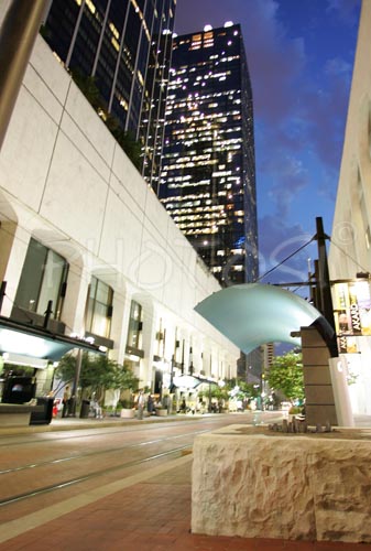 : Tram station in downtown area of Dallas, TX, USA with skyscrapers glowing in late evening twilight sky.