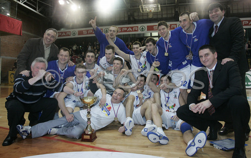 : Players of Helios Domzale are celebrating their victory in final match of Spar Cup between KK Union Olimpija, Ljubljana, Slovenia and Helios Domzale, Slovenia. Match ended with victory of Helios Domzale, who defeated Union Olimpija with 77:70. Match between KK Union Olimpija and Helios Domzale was played in Kodeljevo hall in Ljubljana, Slovenia on 11. February 2007.