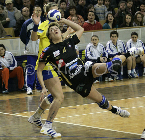 : Olena Yatsenko (no.6) of Krim Mercator shooting on goal during Women Handball Championships League match between Krim Mercator and Cem. la Union-Ribarroja. Krim Mercator, Ljubljana, Slovenia was hosting match of 6th round of Women Handball Championships League against Cem. la Union-Ribarroja, Alaquas, Spain, in Tivoli Arena on 24th of February 2007. Match was won by Krim Mercator with result 34:28.