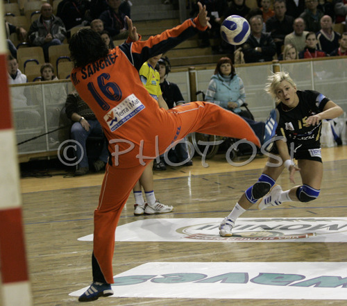 : Dijana Golubic (no.15) of Krim Mercator (R) shooting on goal while Maria Eugenia Sanchez (no.16) of Cementos la Union-Ribarroja (L) is trying to keep her goal closed during Women Handball Championships League match between Krim Mercator and Cem. la Union-Ribarroja. Krim Mercator, Ljubljana, Slovenia was hosting match of 6th round of Women Handball Championships League against Cem. la Union-Ribarroja, Alaquas, Spain, in Tivoli Arena on 24th of February 2007. Match was won by Krim Mercator with result 34:28.